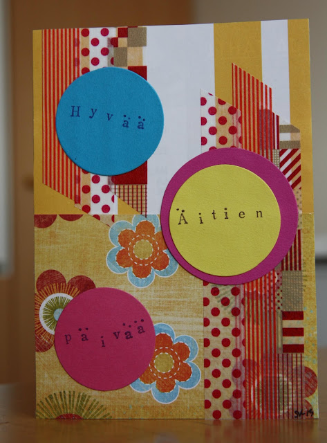 Seuraavat kortit tein ystävilleni Saksassa, joita kävin moikkaamassa syksyllä. Ensimmäisessä kortissa on skräppipaperia, värillistä kartonkia, leimattuja kirjaimia, timanttitarroja, teippiä ja rusetti. Toisessa kortissa on toisen skräppipaperin sijaan vanha kirjan sivu ja rusetin sijaan itse tehty nappi FIMO-massasta. Teipin oli tarkoitus olla suunnilleen Suomen lipun ristin mukainen, mutta ei se ehkä ihan siltä näyttänyt. :)